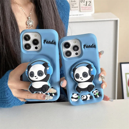 Cartoon Headset Panda Soft Silicone Telescopic Bracket Phone Case For iPhone